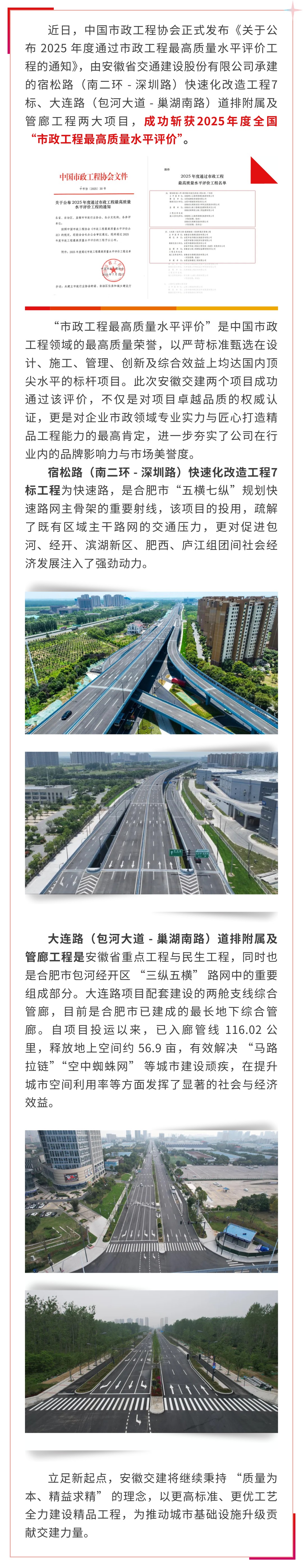 喜報(bào)!安徽交建兩項(xiàng)目斬獲2025年度市政工程最高質(zhì)量水平評價(jià)